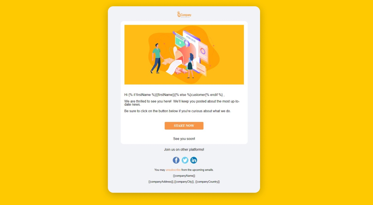 There are tons of ways to greet your customer in your base. But picking a genuine and friendly tone in your text is crucial. Why is that so important? You may ask. For one thing, it’s a known fact that 74,4 % of customers will expect a welcome message from your company once they subscribe or provide their email addresses. Just like they expect that salesperson will greet them in a brick-and-mortar store.